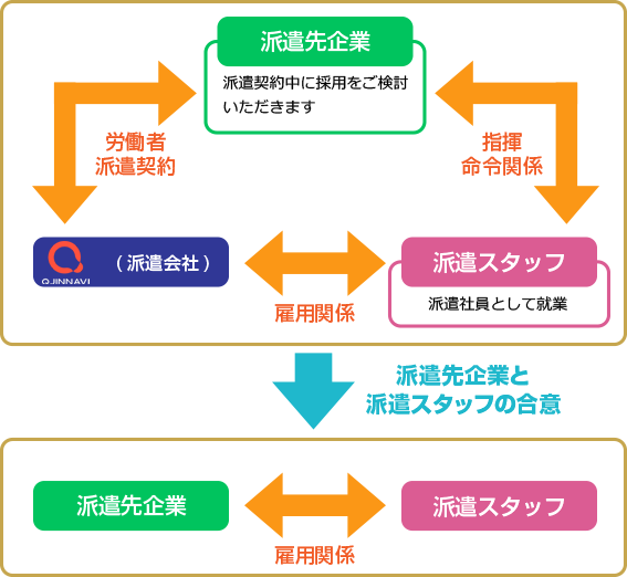 派遣就業前または開始後に、派遣先企業に対して職業紹介することを予定している派遣制度です。一定期間(※最長6か月)を派遣スタッフとして活用し、その後派遣先企業と派遣スタッフの双方が合意すれば派遣先企業の直接雇用となります。